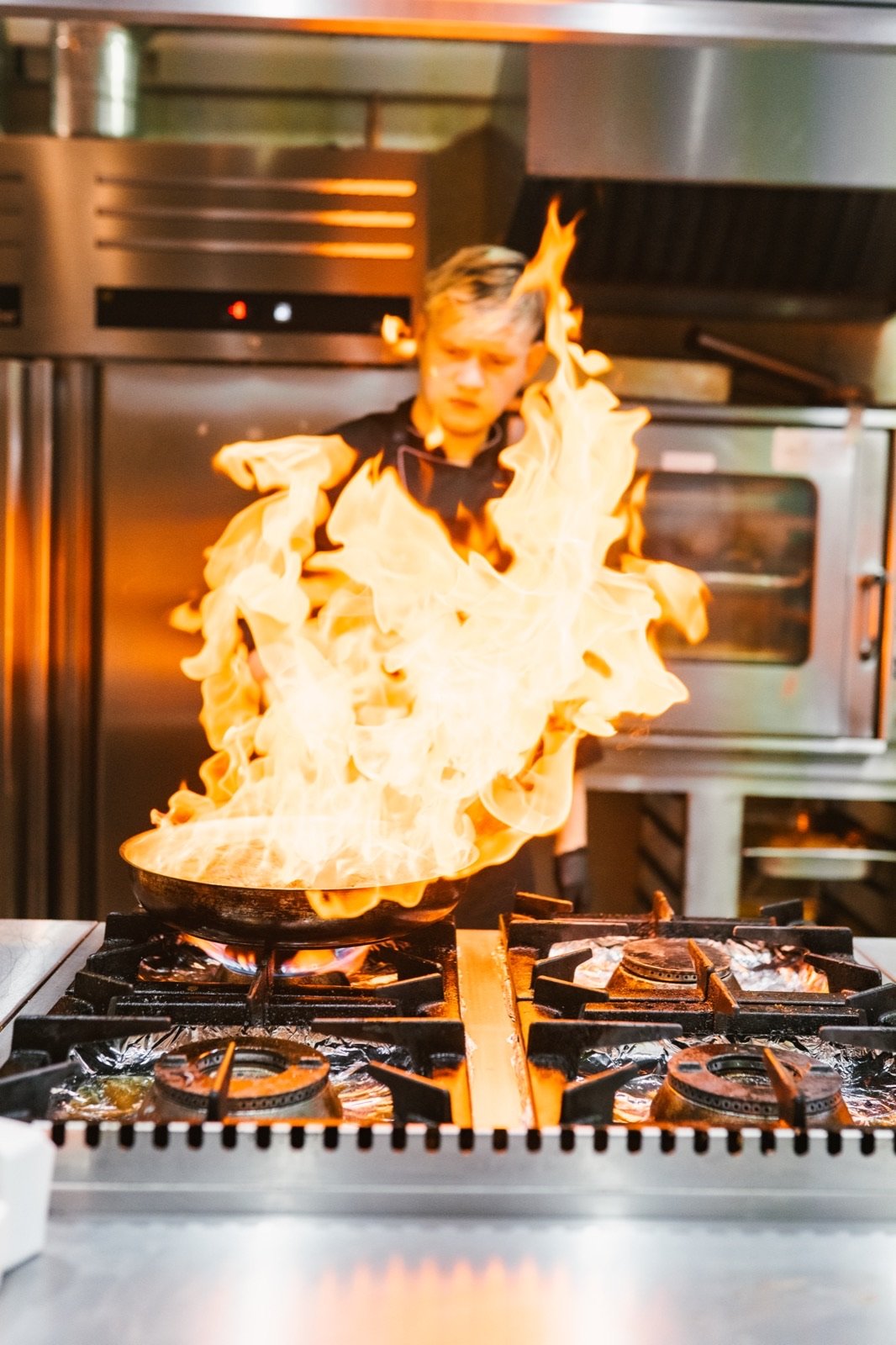 Szef kuchni przy pracy — flambowanie