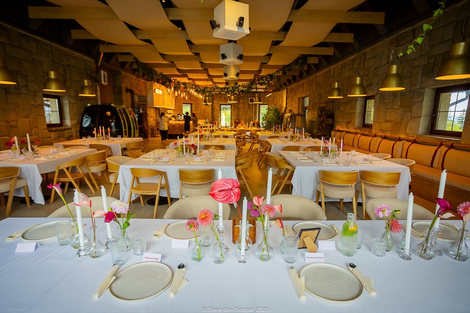 Sala weselna — eleganckie nakrycie ze świeżymi kwiatami